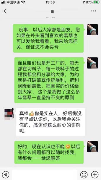 说了这么多,例如还有如何判定翡翠真假?如何界定种水?裂纹对于翡翠价值影响?缅甸手镯抛光粉是怎么回事?。。等等,就不再继续说了,写完可能要几万字,书可以出一本了。 想交流学习翡翠知识可以加我微信: (长按复制) 总之就是大家找到靠谱商家多看多关注,对于喜欢的人,无休止喜欢;若是不喜欢,它就是石头而已。